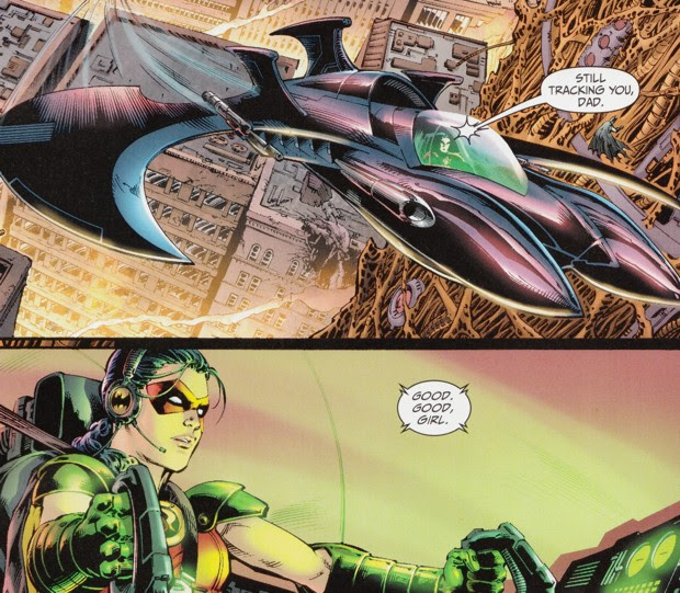 On the last day of the Metropolis war, Robin used the Batplane to circle the Apokolips Command Tower and protect Batman from any Parademons, who tried to kill him.